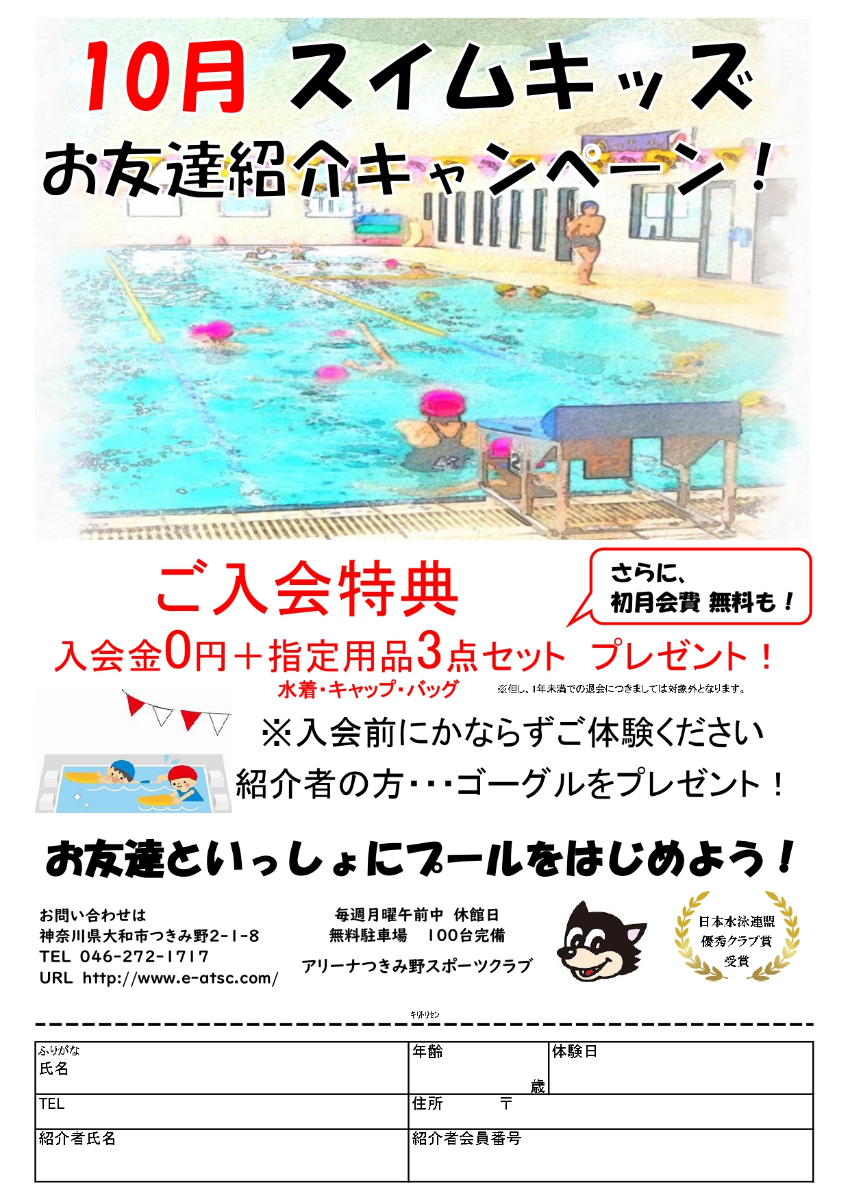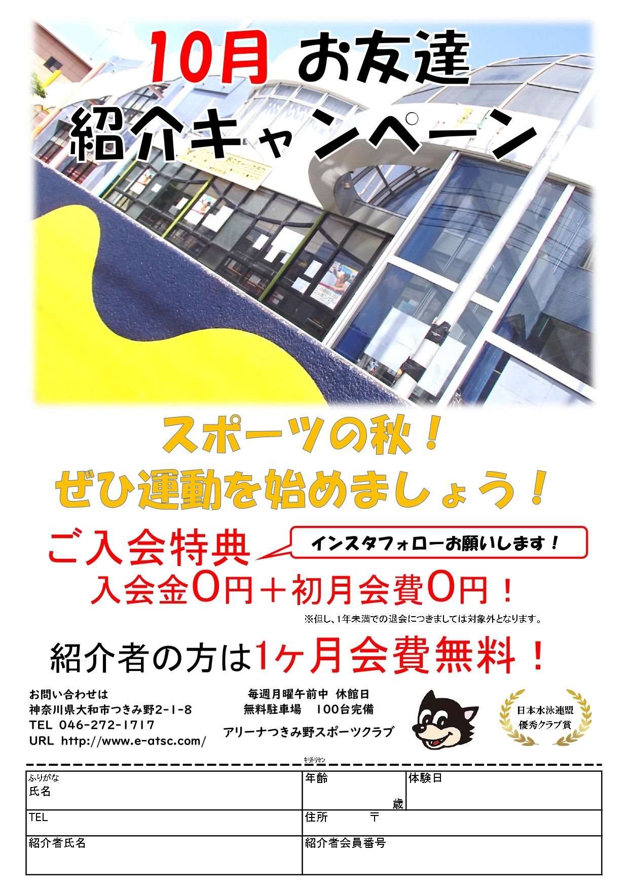 トップページ > NEWS > 10月お友達紹介キャンペーン! 10月お友達紹介キャンペーン! 2025.10.1 スポーツの秋!プールやフィットネスジムに通おうか迷っているお友達に… 子どもも大人もみんなアリーナでいっしょに運動を始めましょう! ≪ ベビークラスイベント ハッピーハロウィン! 「みかん狩りと地球博物館に行こう!」開催決定!! ≫