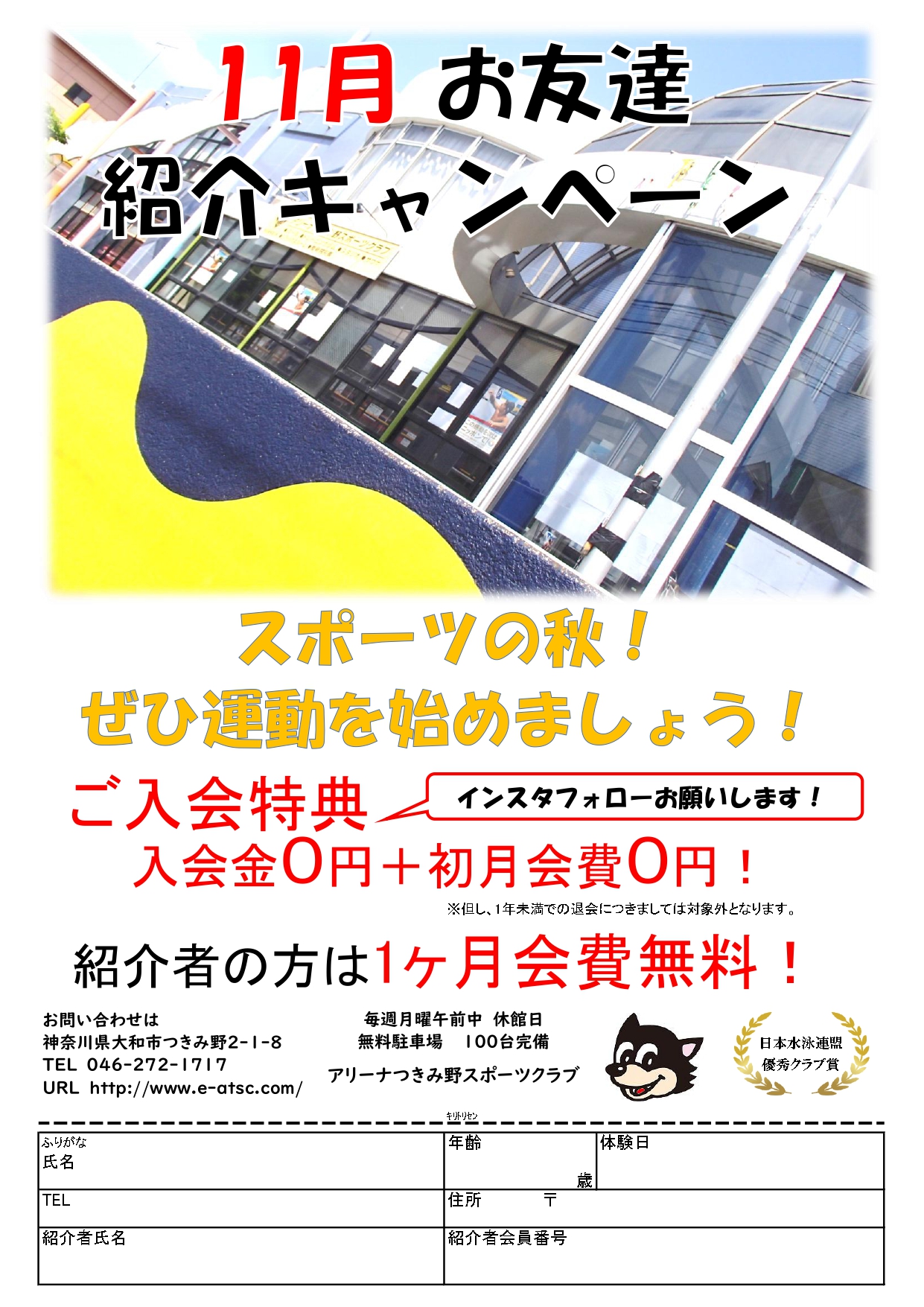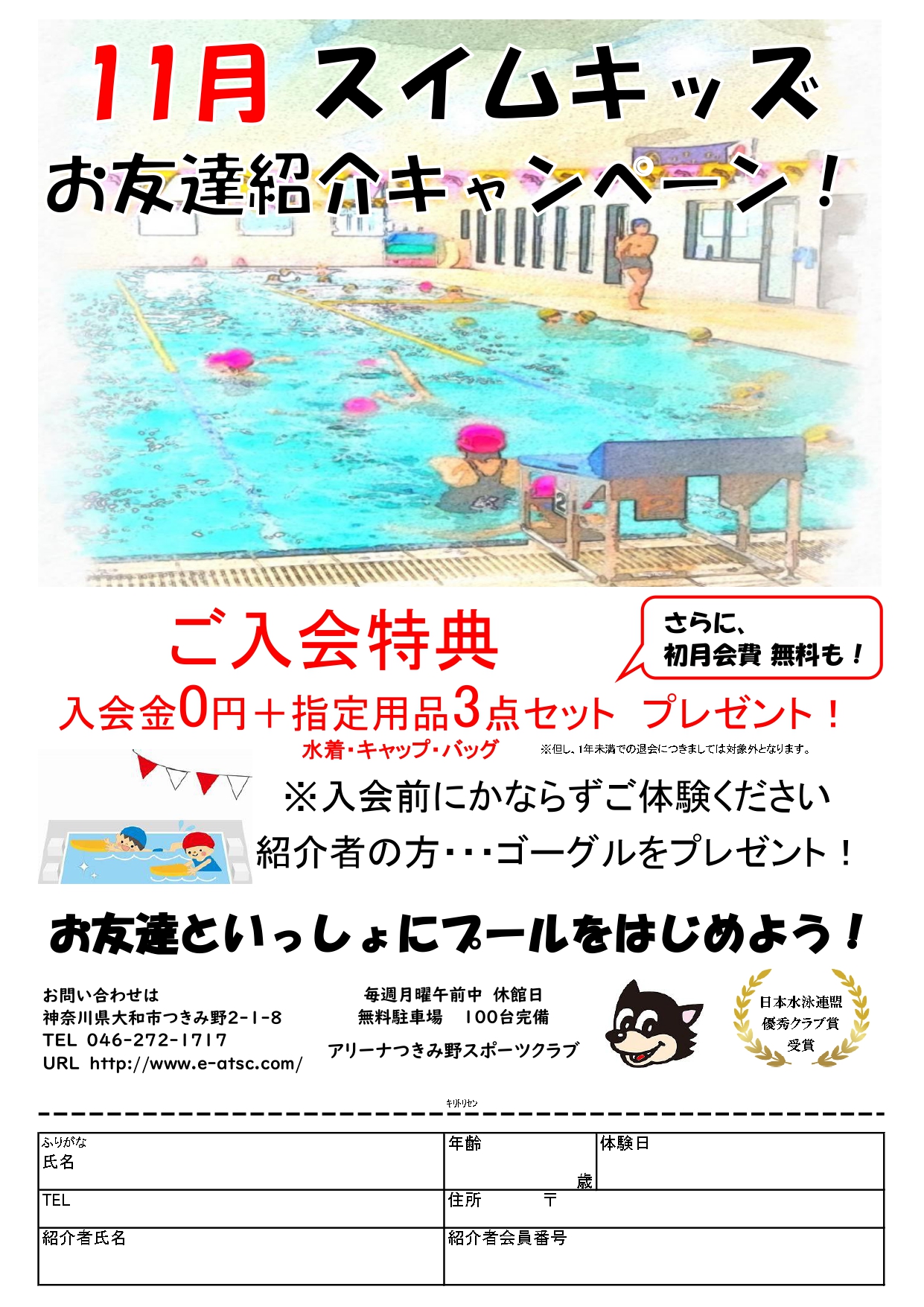トップページ > NEWS > 11月お友達紹介キャンペーン! 11月お友達紹介キャンペーン! 2025.11.1 スポーツの秋!プールやダンス、フィットネスジムに通おうか迷っているお友達に… 子どもも大人もみんなアリーナでいっしょに運動を始めましょう! ≪ 冬の短期水泳教室、開催します! 2026年アリーナカレンダー ≫