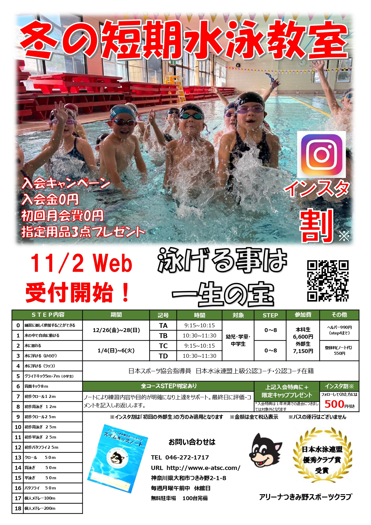 トップページ > NEWS > 冬の短期水泳教室、開催します! 冬の短期水泳教室、開催します! 2025.10.22 「やればできる!」 アリーナの短期水泳教室に参加して泳げる冬にしましょう!! 泳げることは一生の宝です!!ぜひこの機会にプールで泳ぎましょう! 申し込みはコチラより! スマートフォンの場合はコチラからお願いします! PDFダウンロードはコチラより ≪ 「みかん狩りと地球博物館に行こう!」開催決定!! 11月お友達紹介キャンペーン! ≫