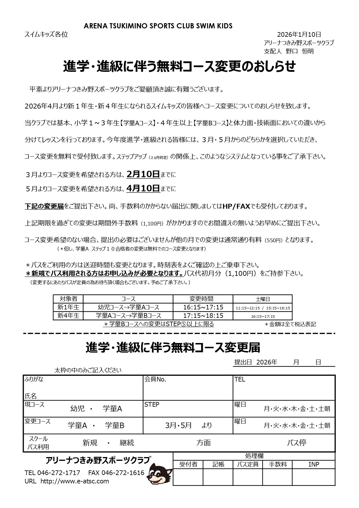 2026年4月より新1年生・新4年生になられるスイムキッズの皆様へコース変更についてのおしらせを致します。